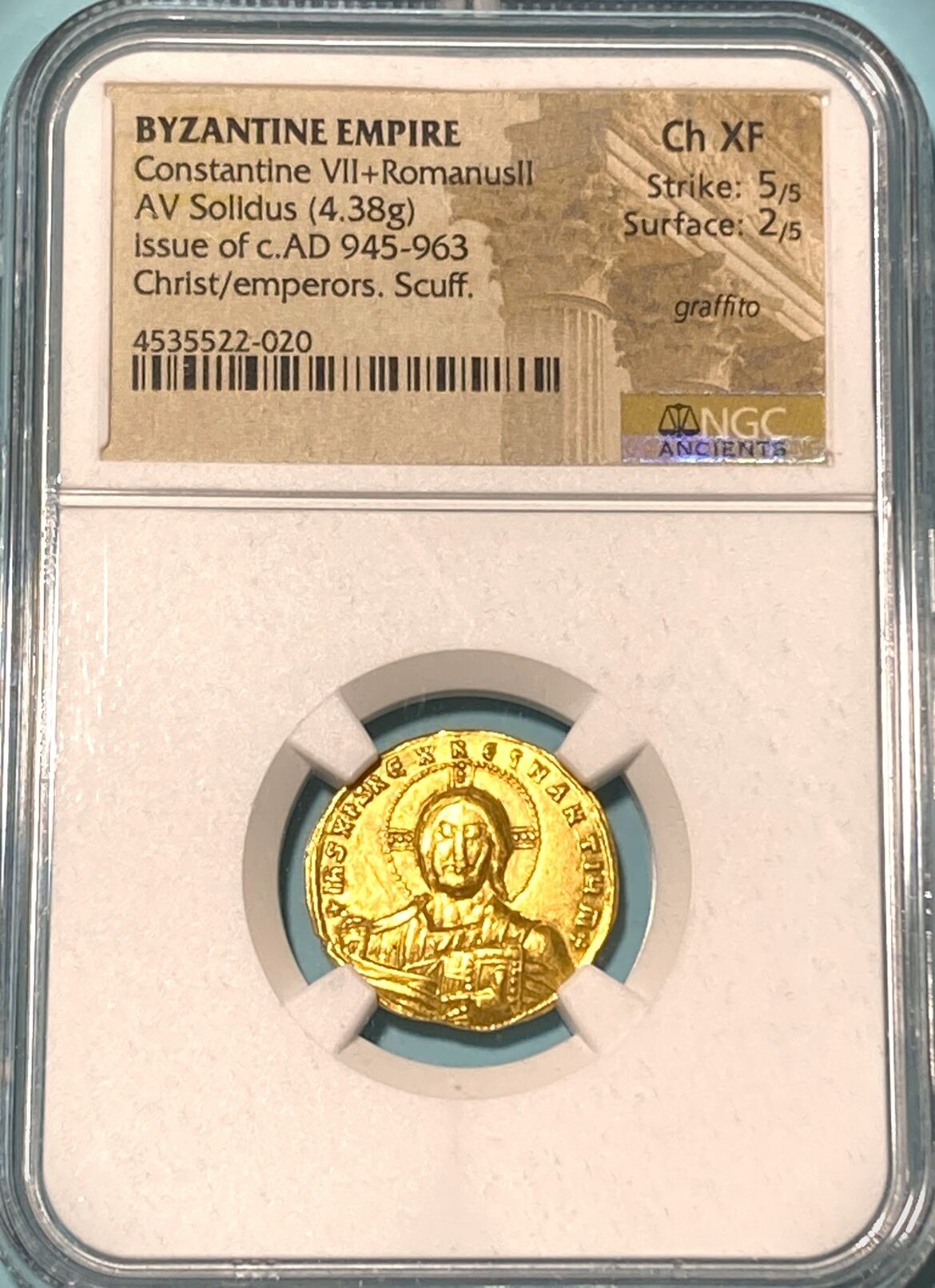 このソリドゥス金貨は、イエス・キリストを描いており、東ローマ帝国の栄華と信仰の象徴として存在しています。発行年代はAD 945-963年頃とされ、当時の宗教的背景と金貨の流通を象徴する貴重な品です。